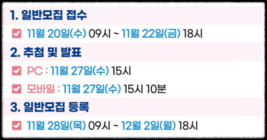 11월 20일 수요일 오전 9시부터 일반모집 본 접수가 시작되니 날짜 잘 체크해서 신청하시길 바랍니다.