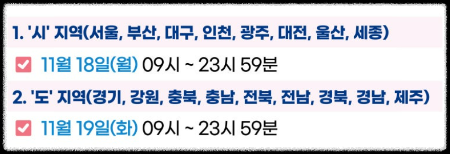 11월 18일에는 ‘시’ 지역, 11월 19일에는 ‘도’ 지역의 사전 접수가 먼저 이루어집니다.