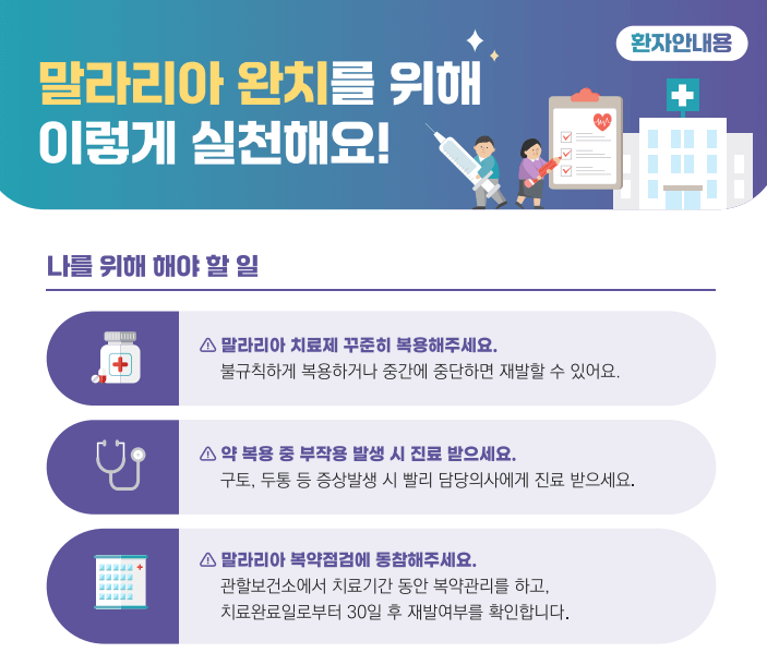- 검사대상 : 말라리아 의심 증상(발열, 오한, 두통, 구토, 설사 등)이 있는 강서구민
